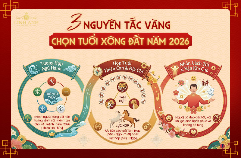Lưu ý: Mặc dù được xem các tuổi xông đất năm 2026 đại cát, nhưng gia chủ cũng cần lưu ý tránh chọn người có tuổi Trực Xung với chính mình (ví dụ: Gia chủ tuổi Thìn không nên chọn người tuổi Tuất dù năm nay tuổi Tuất rất tốt). Sự lựa chọn hoàn hảo nhất là người vừa hợp với năm 2026, vừa không xung khắc với gia chủ.